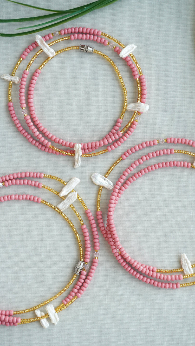 Soft, sacred, and feminine. Bliss is handcrafted with pink beads and baroque pearl stones—designed to honor your beauty, confidence, and divine energy. The pink reflects self-love and softness, while the pearls symbolize grace in every curve.