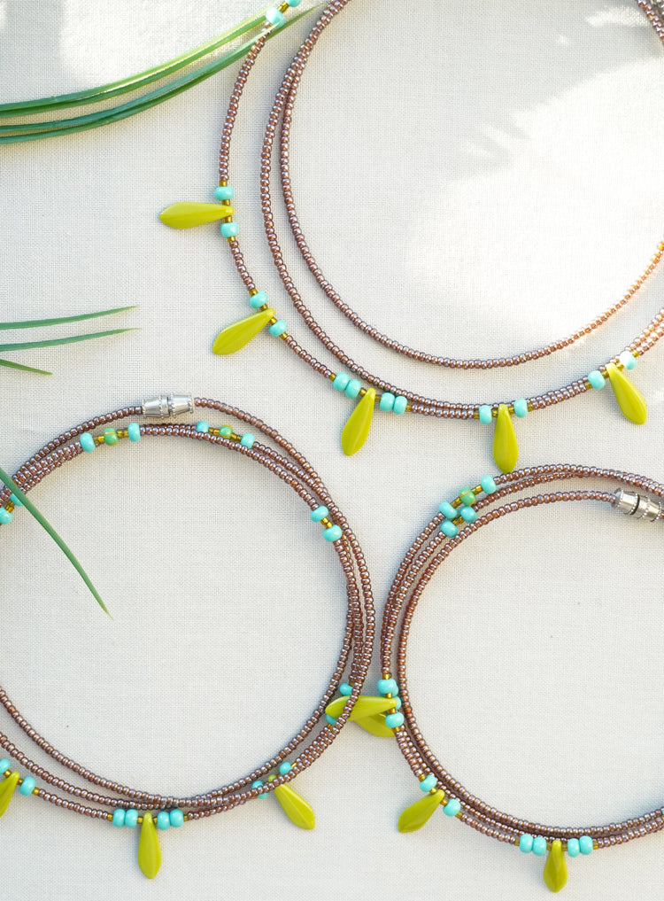 Green Lagoon is crafted with iridescent brown beads accented by soft blue and green tones, finished with lush green hanging beads that move gently with the body. Its palette reflects water meeting earth, calm, grounded, and alive.